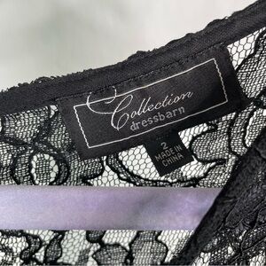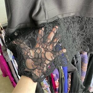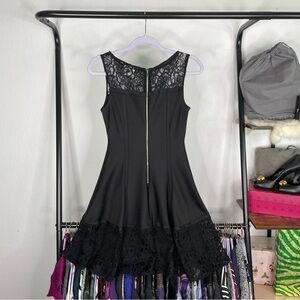 Very thick material that sucks everything in perfectly! Lace trim at the bottom. This is a timeless dress. Semi sheer where the lace trim is. Exposed zipper. Sleeveless.