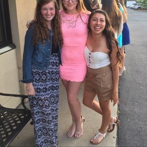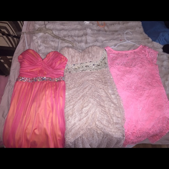 Here are just some dresses im looking to sell. From left to right -> orange sequin dress from macys, cost $69, middle prom dress from nordstrom worn once missing one small sequin cost $180 originally but extremely beautiful, and last pink crochet lace form fitting dress from h&m cost $29. Give me some offers and ask for more pictures if interested.
