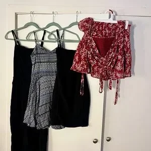 Dress/rompers: all $12 - Black mid-length romper, s (Old Navy) - Blue,white and black sundress, s (Aeropostale) - Black, tight dress, 2 (Pretty Little Thing) - Red 2 piece set, s (Shein)
