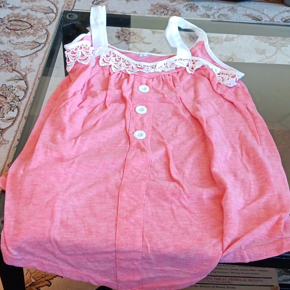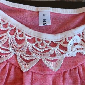 dressbo preowned pink and white women's tank. white lace and button detail. size medium.
