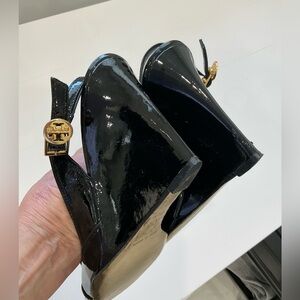 Open toe TORY BURCH pumps/ sandals from patent leather in black with gold tone detailing. Pretty and dressy.