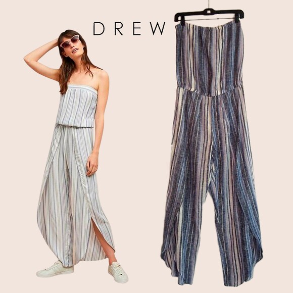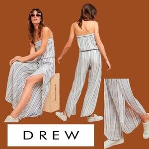 DREW by Anthropologie |NEW| EMERSON Striped Bandeau Multi-Color Sleeveless Side Slit Leg Jumpsuit M. Light and airy for warm, summery weather, Drew's Emerson strapless split leg jumpsuit arrives in the breathable comfort of a soft linen-rayon blend. Woven linen and rayon blend is soft and breathable. You will love it! It is made with excellent quality by DREW by Anthropologie. See all pictures for details and the Table Chart in the pics to size this garment. Specific measurements are provided upon request.