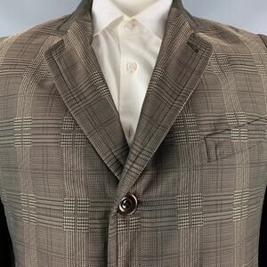 DRIES VAN NOTEN coat comes in a brown and taupe glenplaid polyester woven material with full grey plaid liner featuring a notch lapel, single breasted, double button front, and welt pockets. Made in Belgium.