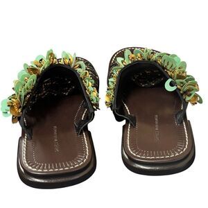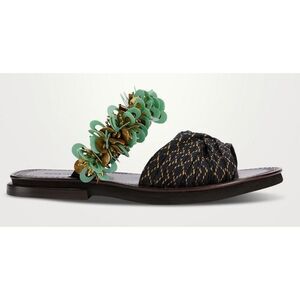 Offering a playful look, these flat sandals have a toe strap comprised of crisscrossing woven laces and a foot strap embellished with mixed beading. They are crafted from leather and have an open-toe, slip-on design.
