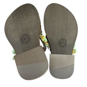 Offering a playful look, these flat sandals have a toe strap comprised of crisscrossing woven laces and a foot strap embellished with mixed beading. They are crafted from leather and have an open-toe, slip-on design.