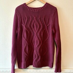 This LAND's END Drifter coastal lagenlook fisherman burgundy sweater features a classic crew neck and a striking cable knit pattern, offering both warmth and style. Its relaxed fit and chunky texture make it a perfect choice for cozy winter days.