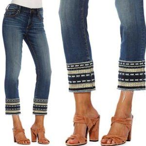 Stylish cropped jeans by DRIFTWOOD. Blue denim with intricate black and white trim at the ankles. Perfect for casual outings.