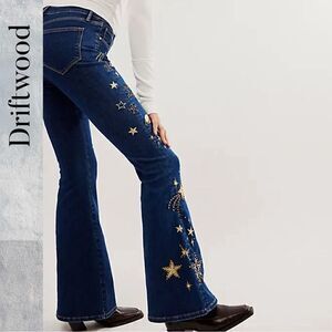 DRIFTWOOD FARRAH EMBROIDERED FLARE JEANS IN DARK WASH SIZE 34