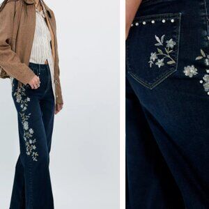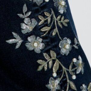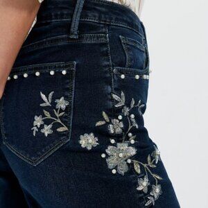 Features: Zip fly and button closure, five-pocket design, daisy embroidery at the front, soft stretch denim