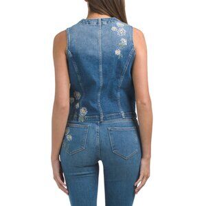 embroidered floral design, denim texture, sleeveless, fabric provides stretch