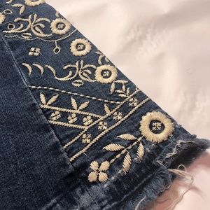 DRIFTWOOD flare jeans 'farrah'. White embroidered floral type pattern. 13.5 inch waist across flat, 9 inch rise, 34 inch inseam. Women's size 27