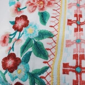 Rust coral salmon peach blue pink red blue embroidery floral flowers botanical design on front and back.
