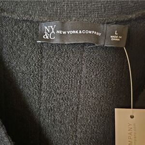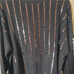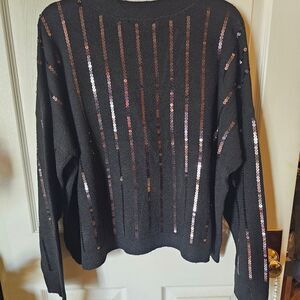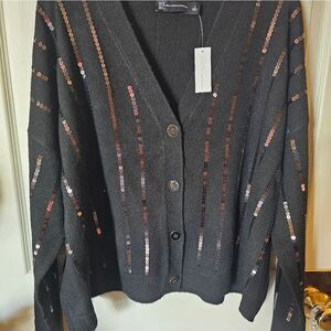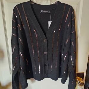 This striking cardigan is a mixture of chic and classic. It features a V neck with front button closure. It has ribbed cuffs and hem. It is a size large. The stripes are done in sequins. It is probably best to wear a black tank underneath to create the right effect. NWT.