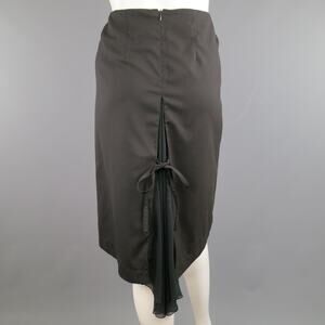 DROZDZIK pencil skirt in a black wool/gabardine features asymmetrical front pleating with pocket on right side, and sheer ruffled chiffon fishtail with bow. Made in USA.