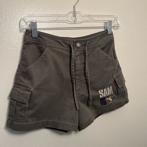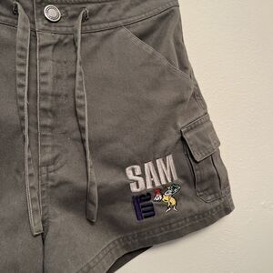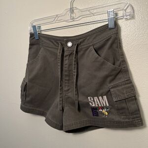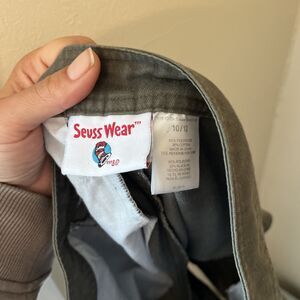 Absolutely adorable pair of vintage Dr. Seuss shorts from the book green eggs, and ham. Features embroidery on the front left corner of shorts. Two front pockets, two side pockets and one hind pocket. Short measure 11 inches long with a 2 1/4 inch inseam and a 10 inch rise. Pants have drawstring for adjustment.