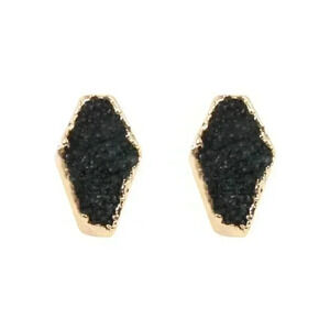 BLACK DRUZY TEAR DROP GOLD TRIMMED EARRINGS.