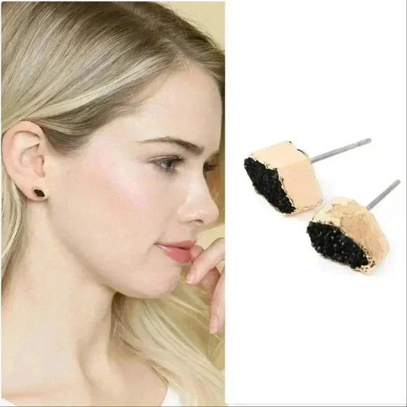 BLACK DRUZY TEAR DROP GOLD TRIMMED EARRINGS.
