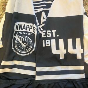 This cycling jersey has slight wear, it is a full zip Jersey by the brand DRV. The zipper works but is missing the pull tab. See pictures