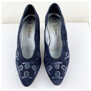 D’Rosana by Charma Women’s Vintage Italian Deep Navy w/Leather Accent Suede Heels Sz 8. Pre-loved as shown, but still a stunning shoe. The blue is so dark it appears almost black. 2.75” sculptural suede wrapped heel. Leather accents at vamp are perforated to give a peek of toe. Please see photos for additional details.