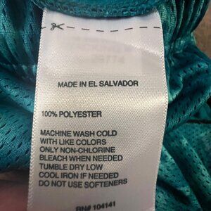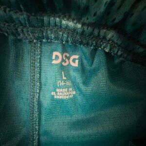These DSG basketball shorts feature an athletic fit and are designed for performance. They are crafted from breathable mesh material and boast a striking teal tie-dye pattern.