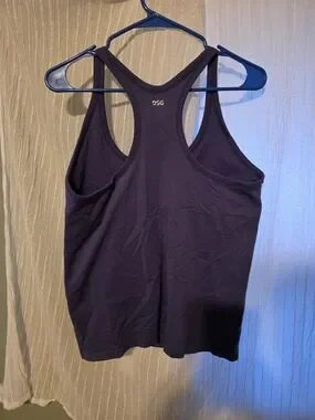 DSG racerback tank in deep purple. Soft stretch fabric for comfort. Sleek, fitted silhouette. Easy to layer or wear solo.