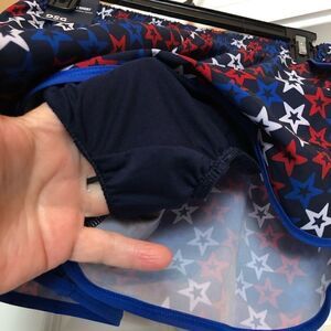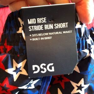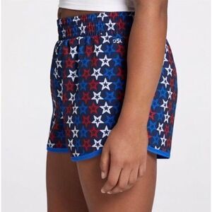DSG (Dick’s Sporting Goods) Girls size XL (16) Stride Running Shorts in “Retro Stars”. These are a standard fit with a mid rise (sits right below natural waist). They have a built-in brief. The waist measurement is 28” (without stretching) the rise is 10” and the inseam is 4”. It has moisture-wicking fabric to move sweat away from the skin and keep her dry and comfortable. They’re 89% polyester and 11% spandex. The built-in brief is 100% polyester. Machine wash and tumble dry.  These shorts are really cute, well made and NWT! 🌠