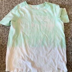Mint green t-shirt with 'Save Our Planet' print. Pastel tie-dye shorts. Comfortable and stylish.