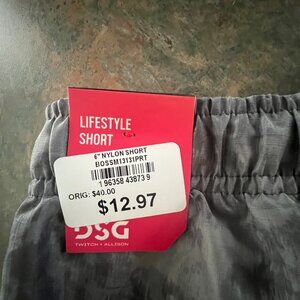 These DSG swim shorts feature a stylish gray tie-dye pattern, designed for both comfort and durability. Ideal for swimming and casual beachwear.
