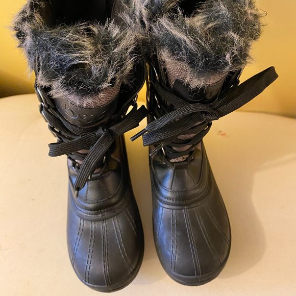 DSG 200 GRAM INSULATION LACE UP WARM WINTER SNOW/RAIN BOOTS. LIKE NEW. RETAILED FOR $149. BLACK LACE UP WITH FAUX FUR TOP. 2-TONE BROWN & BLACK. RUBBER WATERPROOF SOLES AND TOES