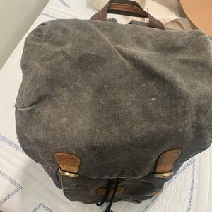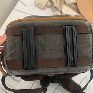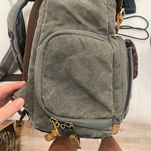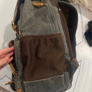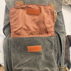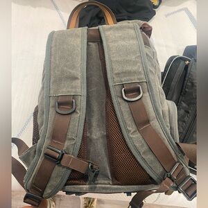 In GOOD CONDITION! Great camera backpack with laptop pocket. Many compartments to hold camera body, lenses, extra attachments, etc. There are removable velcro “walls” to attach inside for different sizes of equipment. Also a smaller front and side pocket. Can access the bottom level of backpack from one side pocket.