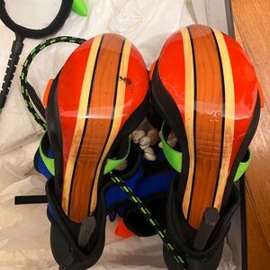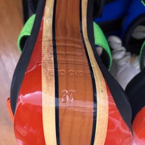 Bold DSQUARED2 sandals with vibrant blue and green straps. Adorned with shell embellishments. Features black and orange accents.