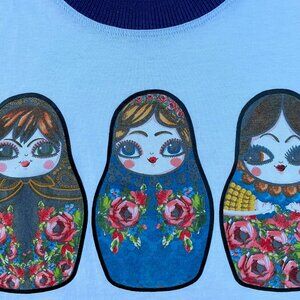 Whimsical, bold pop art matryoshka dolls with provincial Russian floral costume printed and silkscreened on quality 100% cotton tee shirt. Created by artists from the Italian fashion house DSQUARED2, these colorful, charming triplets will no doubt put you in a happy mood. The ringer collar/arm style adds to the vintage sporty look. Measures 16" armpit to armpit, 24" length, size Small fitted. Pristine condition, worn once, washed once. Last two are stock photos.