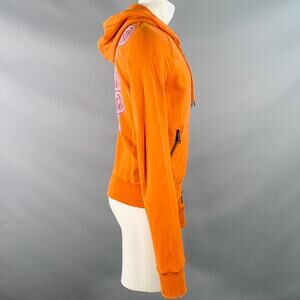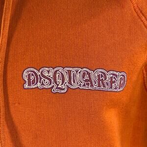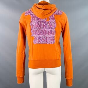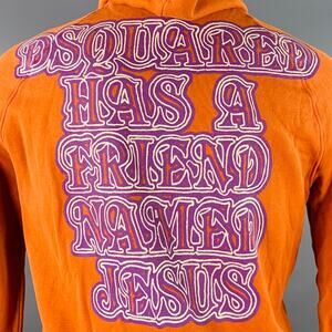 DSQUARED2 sweatshirt in an orange cotton featuring a hooded style, purple "DSQUARED HAS A FRIEND NAMED JESUS" print on back, and zip up closure with double zipper. Note: this garment's sleeves have been slightly stretched out unevenly due to wear. Please double check measurements.