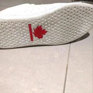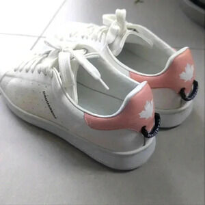 DSQUARED2 Women's White & Pink Leather Lace Up Sneakers w Rubber Sole with Red Maple Leaf detail - size 39 like new. US size 8.5. Made in Italy. Bought for $450 plus tax.