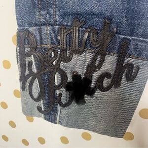 •Features: Medium wash crop jeans with slight factory fade. Suede patch and pocket detail. Leather “Betty B**ch” patch sewn on leg. Cuffs are sewn. Teal zipper detail. Back button flap pockets.