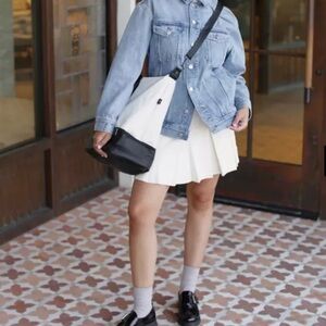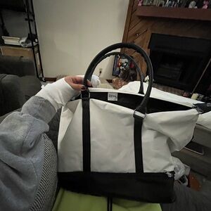 Elegant tote bag with a sleek design. Features black handles and accents. Spacious interior for essentials.