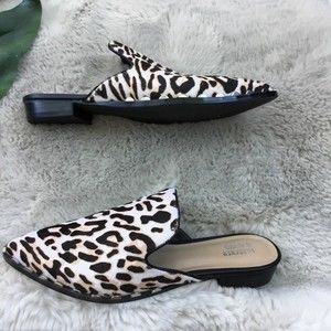 Stylish leopard print mules. Slip-on design. Comfortable flat heel.