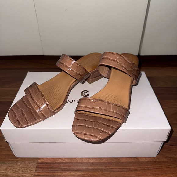 Elegant tan sandals with a stylish croc pattern. Ideal for casual and formal wear.