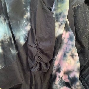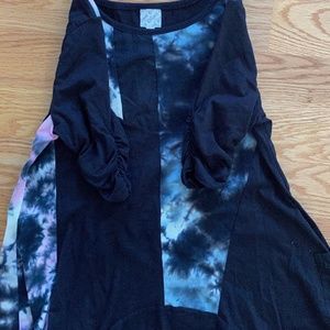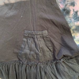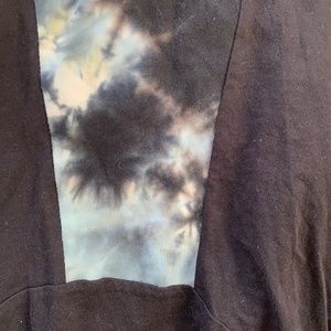 Super cute dress! I don't think this was ever worn--and there are no signs that it has. 100% cotton. Black thick cotton T material. Lace at the hem. Short sleeves with ruching. Panels of tie-dye design. 1 small pocket. Can truly be dressed up or dressed down. Size XL
