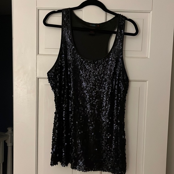 Black matte sequin, racerback tank top. Long. Great with a blazer of alone with shorts/jeans