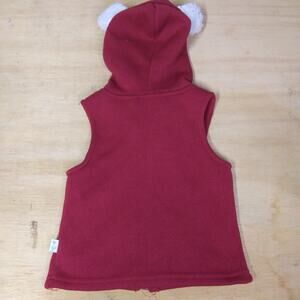 Deep red sleeveless knit sweater vest with attached animal ear hoodie and cute little embroidered style tiger cub.