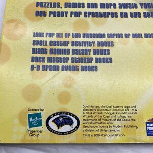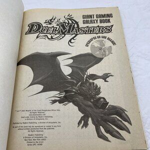DUEL MASTERS Giant Gaming Galaxy Activity Book is a softcover activity book published by Modern Publishing in 2004. The book is based on the Duel Masters series, featuring creatures on the attack. It is an illustrated book with black and white style, intended for children and young adults. The book includes games and action/adventure stories related to the Duel Masters universe, which is from Cartoon Network. The book is unused and has not been inscribed or signed.