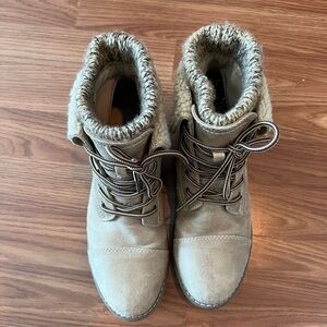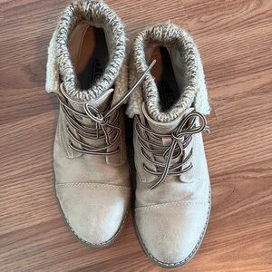 Lightweight hiking boot features sweater collar and fold down fleece cuff.