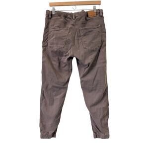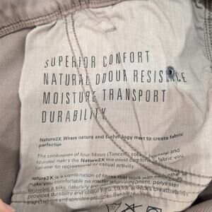 You're viewing a pair of gently pre-owned du/er Men's Pants, size 34x29, in a stylish brown color. These pants offer superior comfort, natural odor resistance, and excellent moisture transport. Designed for durability, they feature a nature 2X slim fit style with a stretchy waistband for added flexibility.