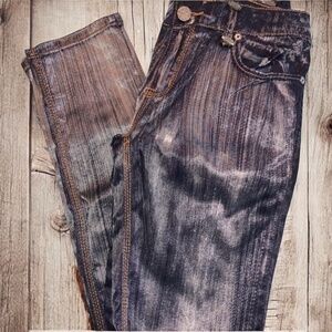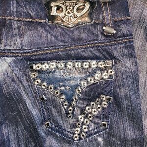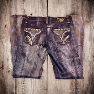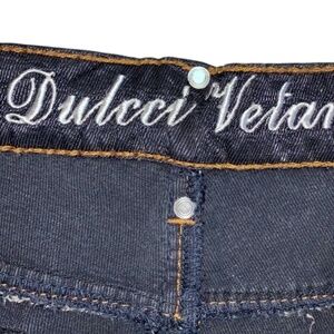 DULCCI VETAN JEANS SIZE 29 SHINY JEWELED WITH METAL APPLIQUES ON BELT LOOPS WAIST – 29” RISE – 8” LENGTH – 30” 95% - COTTON 5% - SPANDEX *241
