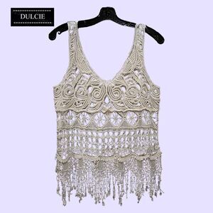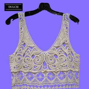 DULCIE |NEW| Crochet Paisley/Medallion Fringed Hem 100% Cotton Overlay Beige Top M. Beautiful design of paisley and medallions print on this tank that is perfect for the sunny weather. See the pictures for all the beauty of this top. Needs layering. Perfect over colorful tanks, tops, or swimwear. You will love it! See pictures for all details and the the measurements provided below/the Table Chart in the pics to size this top.