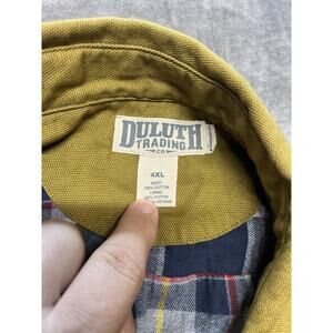 The Duluth Canvas Yellow Mustard Jacket Shacket in size 4XL is a durable and stylish outerwear option designed for men who appreciate a gorpcore or farm work aesthetic. Made with cotton outer shell and lining, this jacket features a solid yellow color with a button and snap closure. Perfect for travel, casual outings, or workwear, this jacket is ideal for winter and fall seasons, making it suitable for walking, hunting, or hiking activities. The Duluth brand ensures quality and the lined feature adds extra warmth for added comfort.