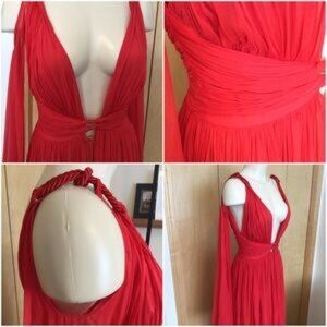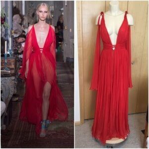 Echoing romantic Grecian styles, Dundas’s debut runway collection features this bold red gown. It's crafted in Italy from silk-chiffon with slim shoulder straps that are gathered from the seams, and feature detachable long fluted sleeves attached to twisted rope. It’s shaped with a deep V-neck and back for a sultry touch and is cinched with a twisted waistband