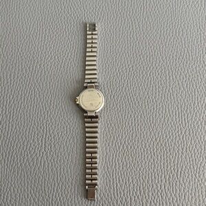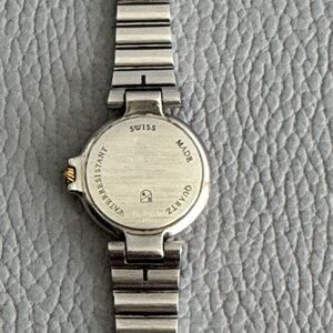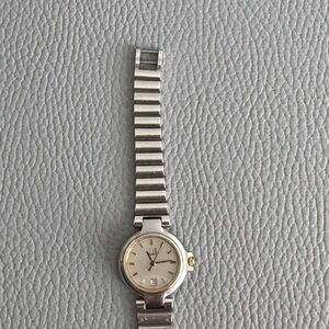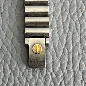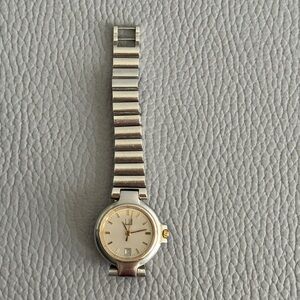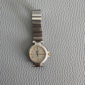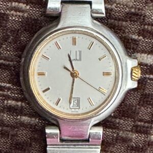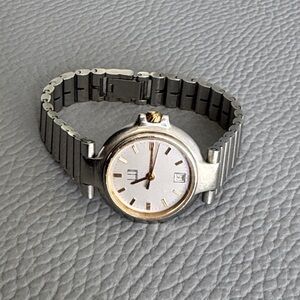 DUNHILL ladies Swiss watch. Quartz and water resistant. Elegant silver and gold two-tone watch with a sleek design. Date on bottom with a second hand. Silver tone face with gold tone stick numbers. In working condition. I put in a new battery from my jeweler a week ago. Still ticking. Great pre owned condition with some wear but plenty of wonderful years left. Watch with band measures 7”. Please check photos for a better look and contact me with any questions.