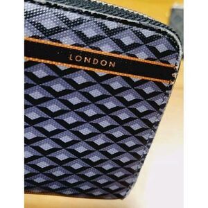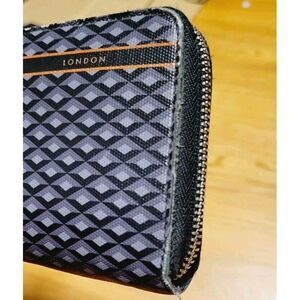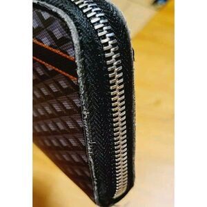 This DUNHILL coat wallet is the perfect accessory for any stylish individual who values functionality and luxury. Crafted from durable luggage canvas, this wallet features a classic argyle/diamond pattern in a sophisticated grey color. The wallet also boasts a unique zipper closure and accents that add a touch of personality to the design.
